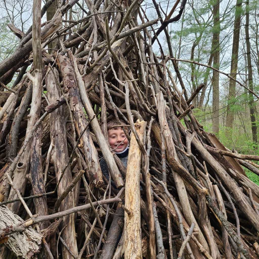 “How much longer?” he asked, over and over and over again, as he exaggeratingly stomped forward. Then he spotted a forest hut fashioned from fallen branches and promptly ran away to climb inside, smiling.